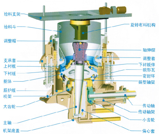 旋盤式破碎機不用于圓錐破碎機。一般圓錐破碎機都是采用破碎執行部件直接擠壓物料的破碎。旋盤式破碎機采用的則是“層壓破碎”,就是將破碎機的破碎執行部件對物料的擠壓與沖擊作用轉變為多層物料粒子間相互沖擊與研磨的綜合作用,從而實現物料破碎。